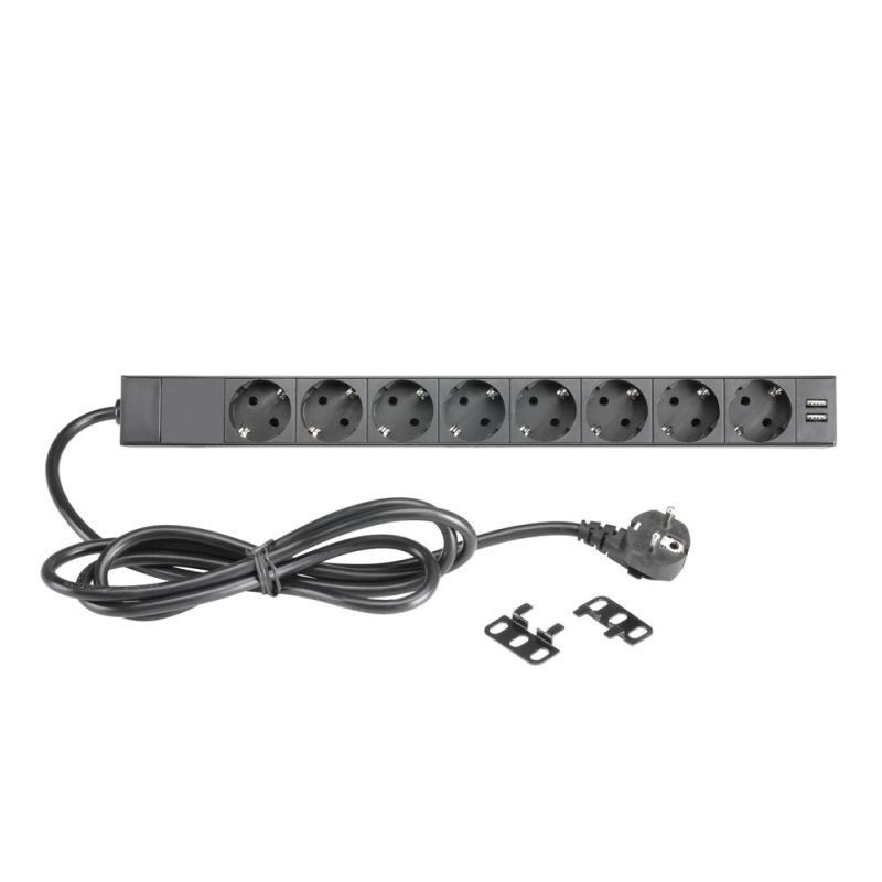 8-Outlet 19" Rackmount Power Strip With Dual USB Charging Ports And On/Off Switch. Rated @ 250 V, 16 A aluminium housing with 8 rear panel outlets 2 front panel USB charging ports Illuminated front panel on/off switch 2 m power cord Reversible rackmount angle brackets included