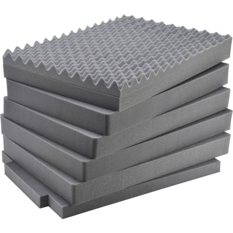 - Six-piece foam set contains one 1.08" base pad layer, one 1.75" cubed foam layer, three 3.0" cubed foam layers, and one 3.88" convoluted top lid foam layer